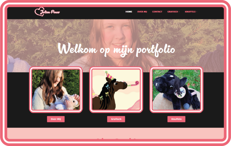 Mijn website-portfolio heb ik volledig zelf ontworpen en gebouwd. Ik vond het belangrijk dat het niet alleen mijn werk laat zien, maar ook mijn persoonlijke stijl en creativiteit weerspiegelt. Daarom heb ik mijn eigen huisstijl in het hele ontwerp verwerkt, van de kleuren en typografie tot de illustraties en kleine details. Op deze manier vormt mijn portfolio één geheel met de projecten die ik maak en zie je meteen wie ik ben als maker.